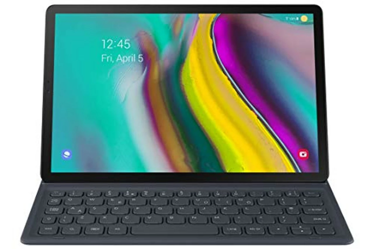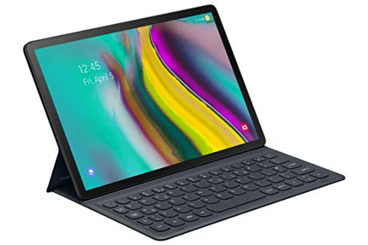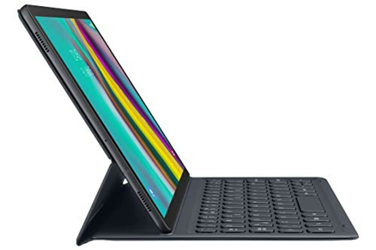 Stylishly efficient. Start typing in a flash. With its sophisticated texture design and intuitive POGO pin connectors to simplify setup and speed up usage time the Galaxy Tab S5e Book Cover Keyboard is equally practical as it is pleasing to the eye.