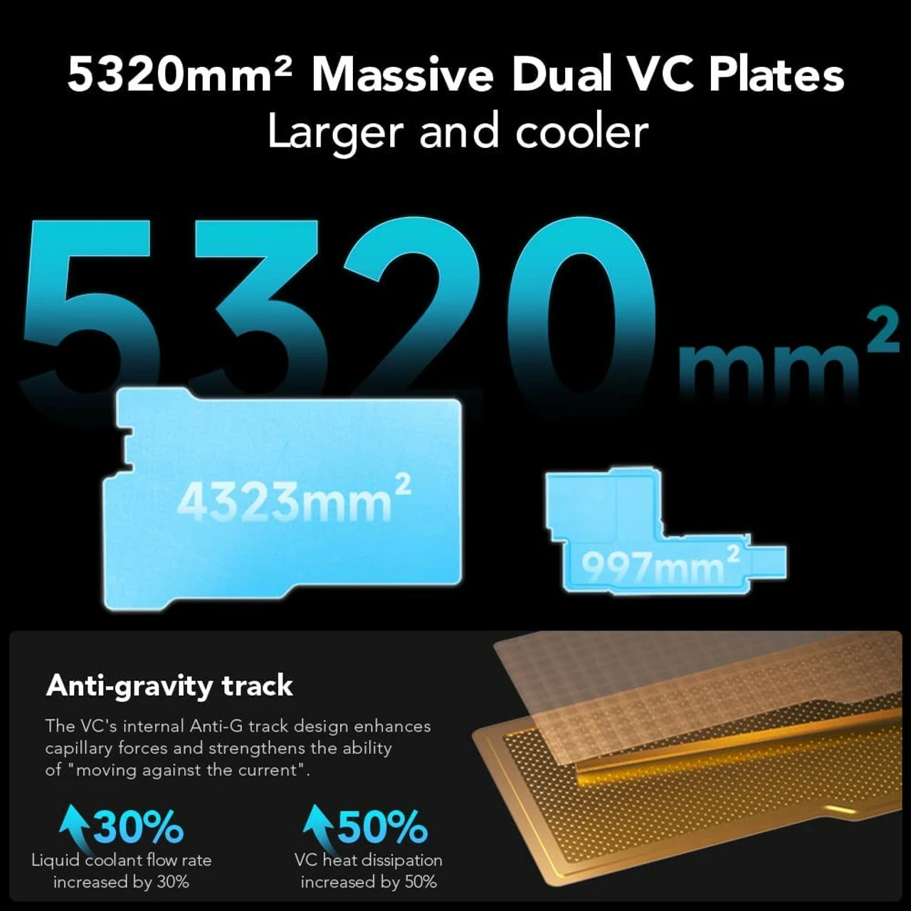 And once you’re charged, the Black Shark 5 can be powered directly from the charger, to help conserve battery life and reduce heat. Speaking of heat, the Black Shark 5 introduces an anti-gravity dual-VC cooling system, so you’ll be ready to game for extended periods.